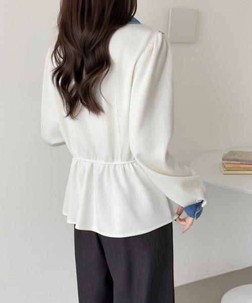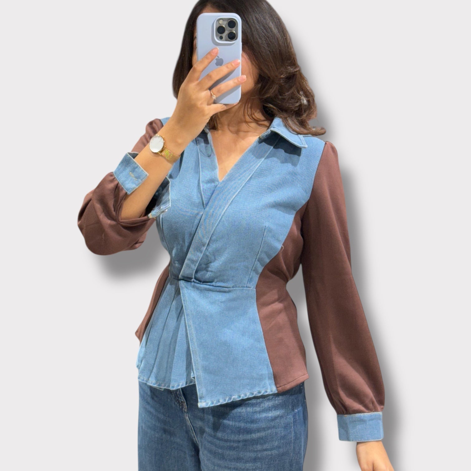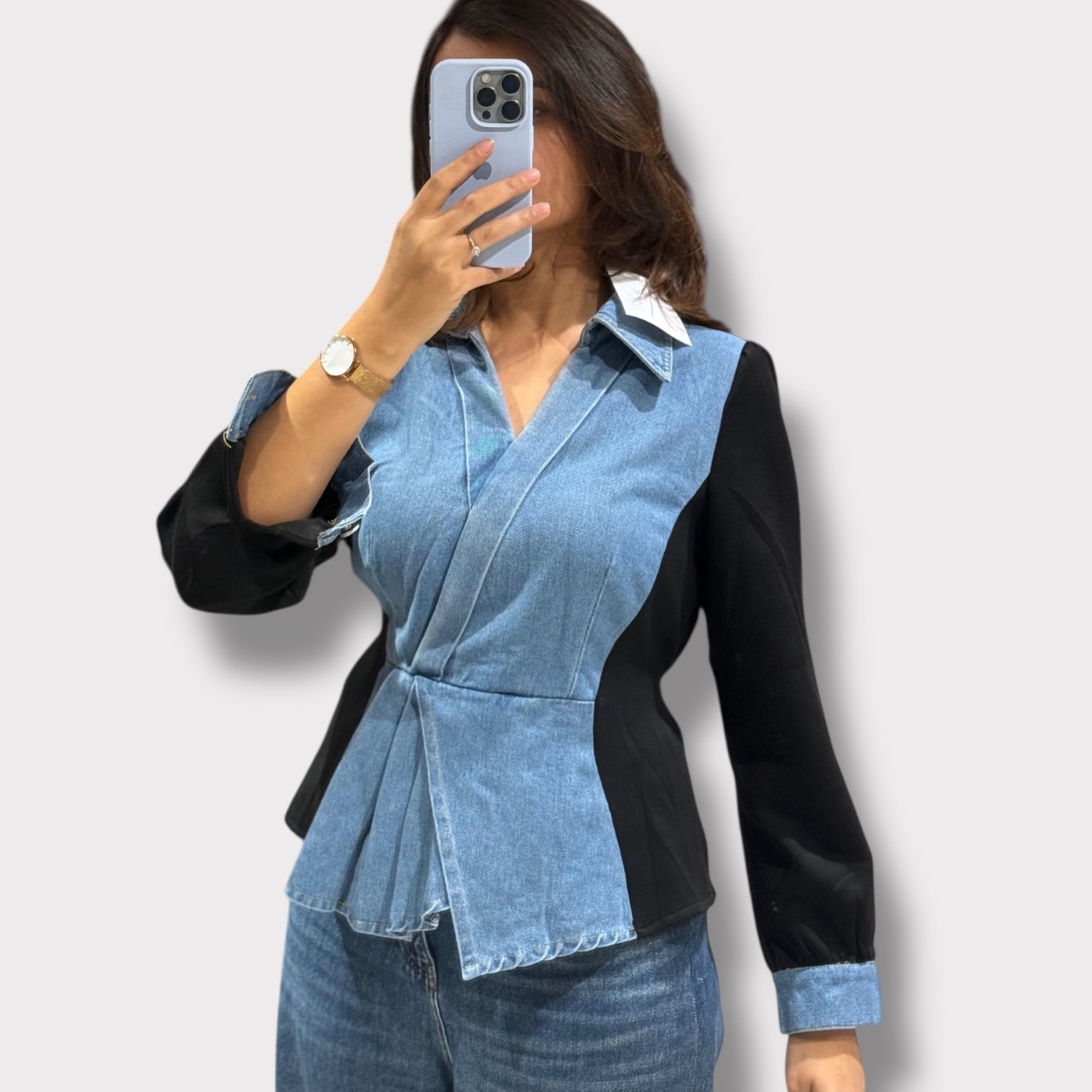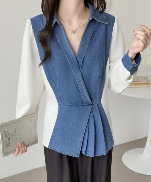 Size - Free size product ideal for S to XL Detail – Chic denim top featuring a structured overlap neckline, contrast panel detailing, and softly puffed full sleeves with cuff accents for a flattering, modern silhouette Occasion – Perfect for casual outings, brunches, travel days, or relaxed workwear