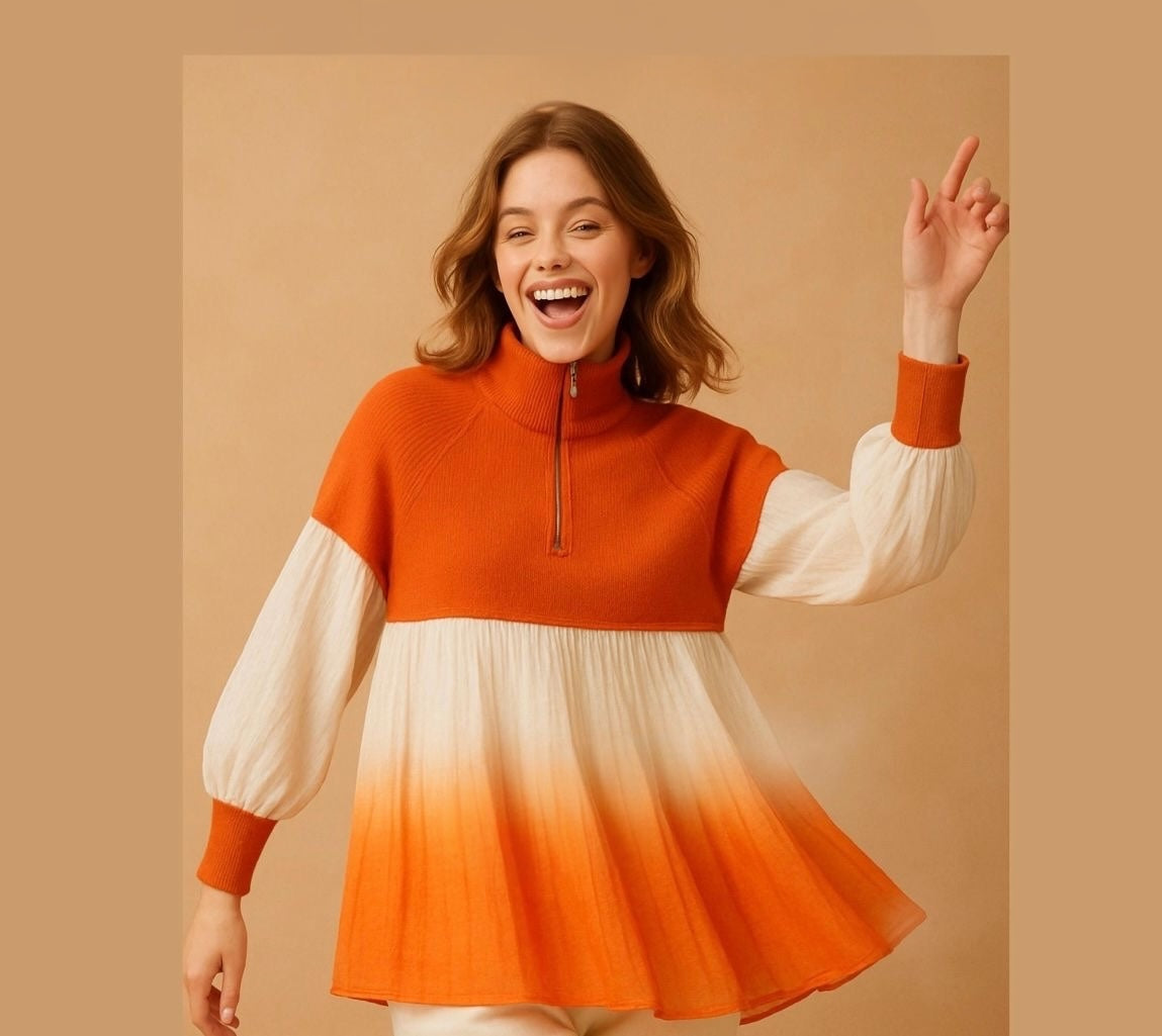 Size - Free size product ideal for M to 4xl Chic high-neck top with zip detailing, featuring pleated ombre fabric and balloon sleeves. Made from soft, breathable material for all-day comfort. Perfect for casual outings, brunches, or light evenings.
