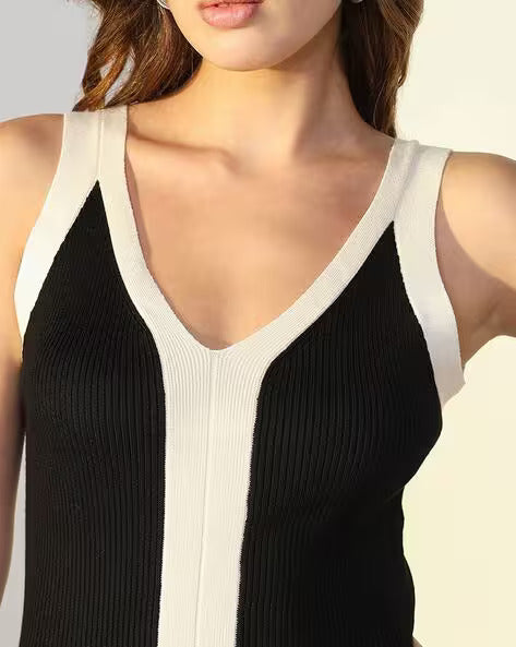 Size: Free size dress ideal for S to L Fabric: Premium stretch-knit blend that hugs the body while allowing ease of movement Fit: Bodycon silhouette with a flattering V-neck and bold contrast paneling Styling Tips: Pair with strappy heels or mules for a sleek evening look, or add a blazer for a power-lunch outfit Occasion: Perfect for cocktail nights, dinner dates, or upscale workwear Care: Gentle hand wash or dry clean